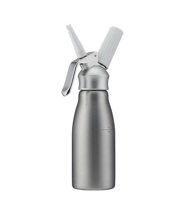 Slagroomapparaat 0,5L ook uitermate geschikt voor het verwerken van o.a. bavarois die als halffabricaat te verkrijgen zijn, met twee verschillende spuitjes.