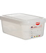 Bewaardoos GN1/4 luchtdicht afsluitbaar door uniek dubbel afsluitsysteem en absoluut smaak- en reukvrij, geschikt voor vriezer -40 °C en magnetron +100 °C (zonder deksel), wordt compleet geleverd met product coderingsset volgens de HACCP normen.