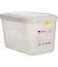 Bewaardoos GN1/4 luchtdicht afsluitbaar door uniek dubbel afsluitsysteem en absoluut smaak- en reukvrij, geschikt voor vriezer -40 °C en magnetron +100 °C (zonder deksel), wordt compleet geleverd met product coderingsset volgens de HACCP normen.